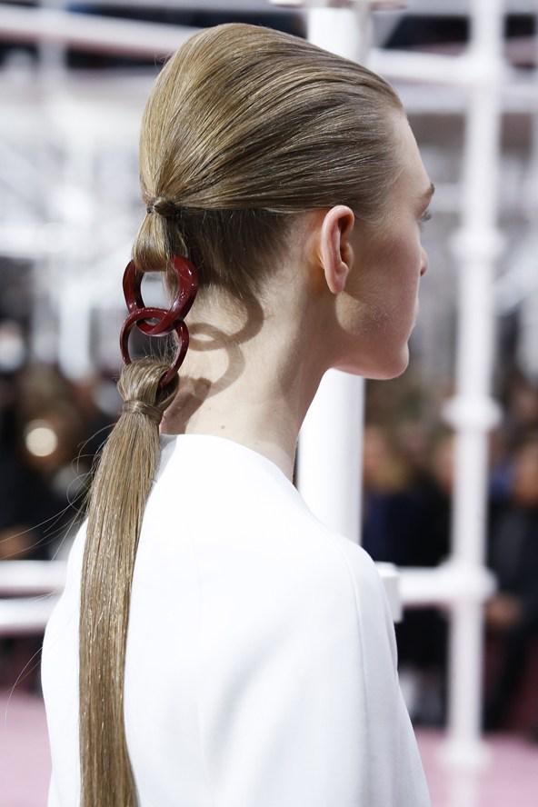 Very interesting sleek, couture ponytails by Dior. Worn with slick hair back tight at the bottom and teased up at the top, with long hair extensions attached to hoops. Comes in different colours