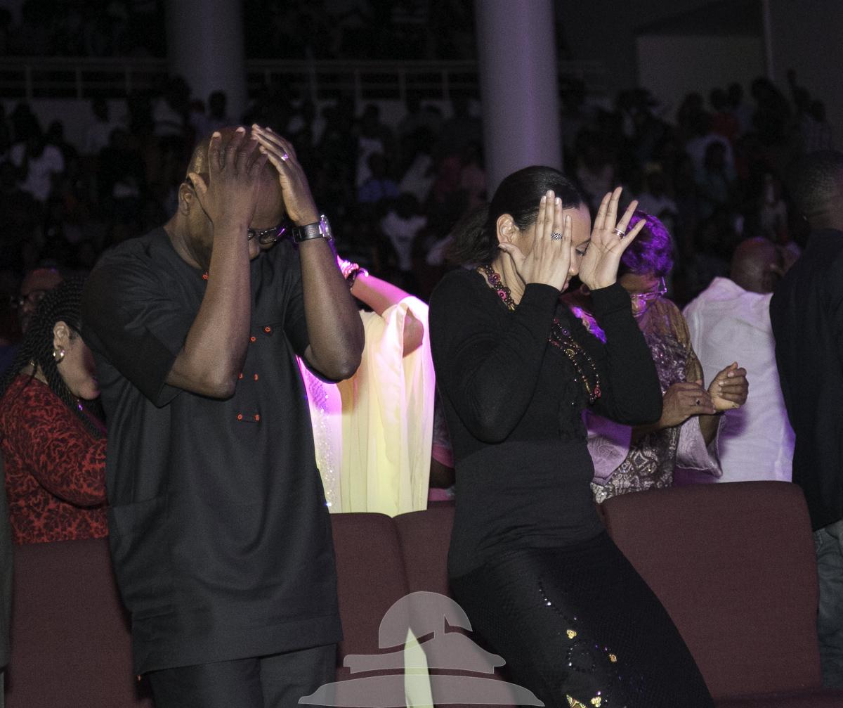This picture captures the moment when music group, Midnight Crew was singing the chorus of their hit song, "Oruko Jesu l'omo ri mi wu" which in literally means The Name of Jesus makes 'my head swell'; Pastor Ifeanyi is the wife of the Senior Pastor of the chuch, Pastor Paul Adefarasin.